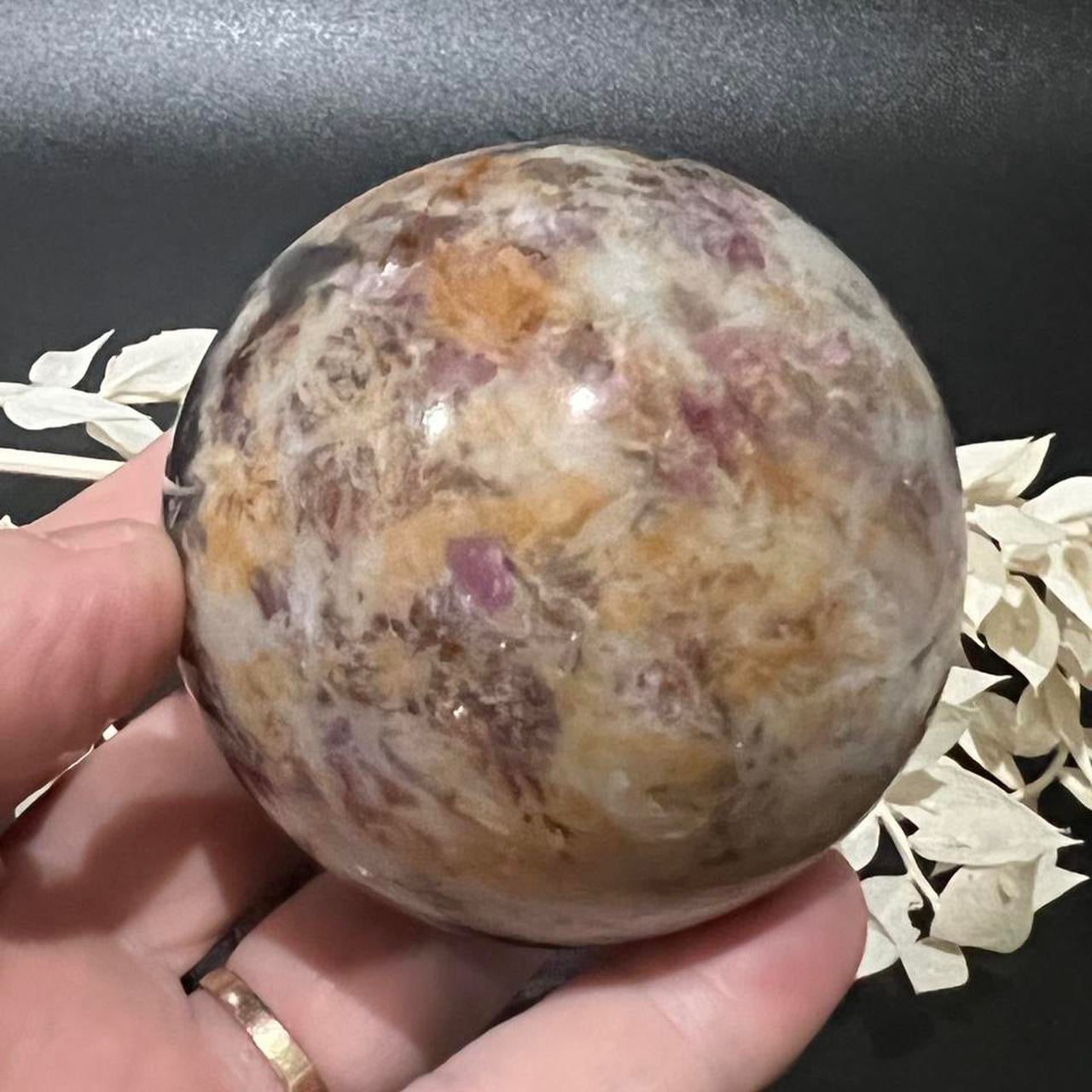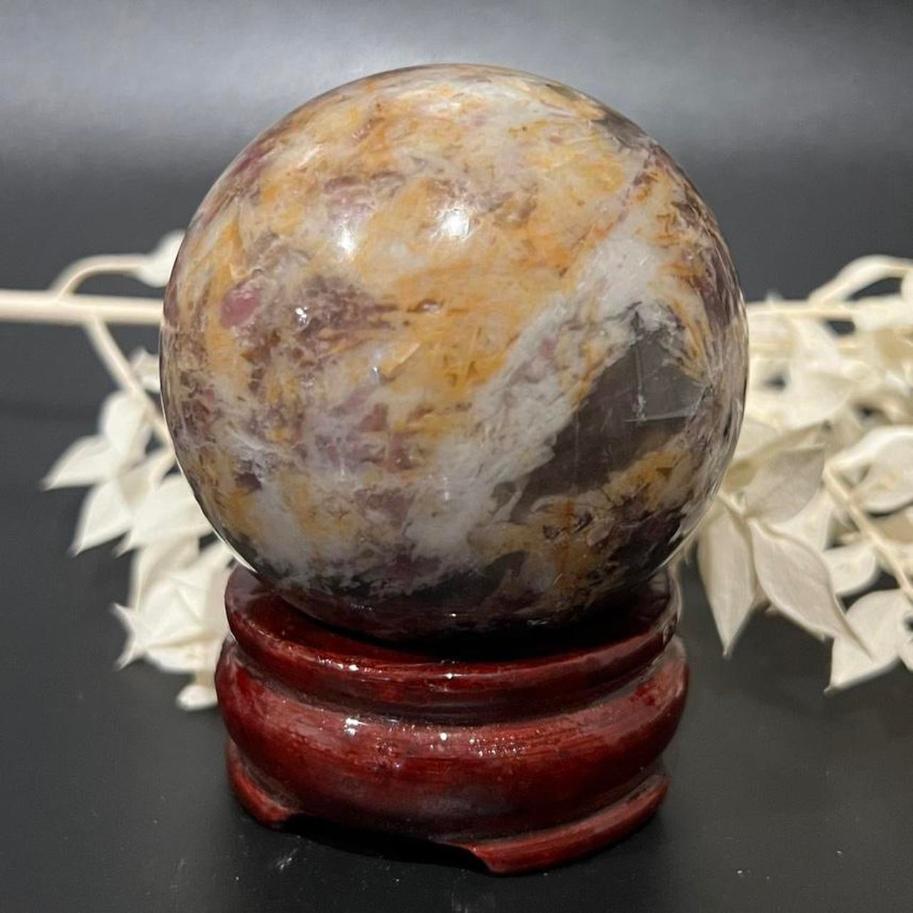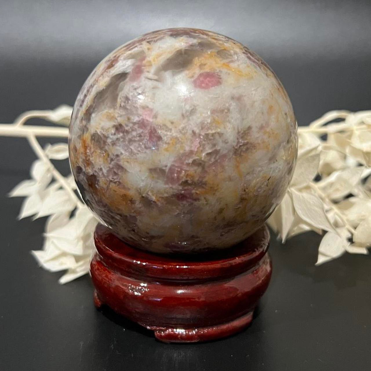 This absolutely stunning Pegmatite Sphere is a rare crystal found in Madagascar. It is made up of Pink Tourmaline, Lepidolite and Smokey Quartz.