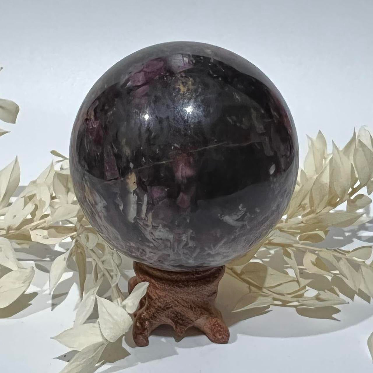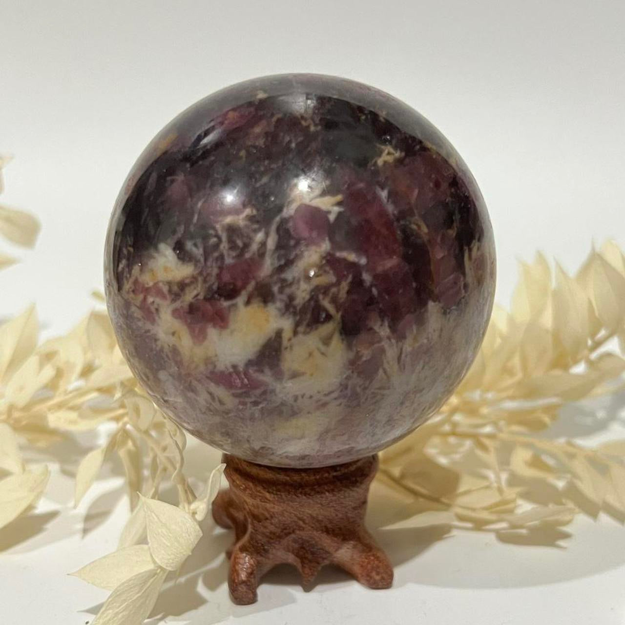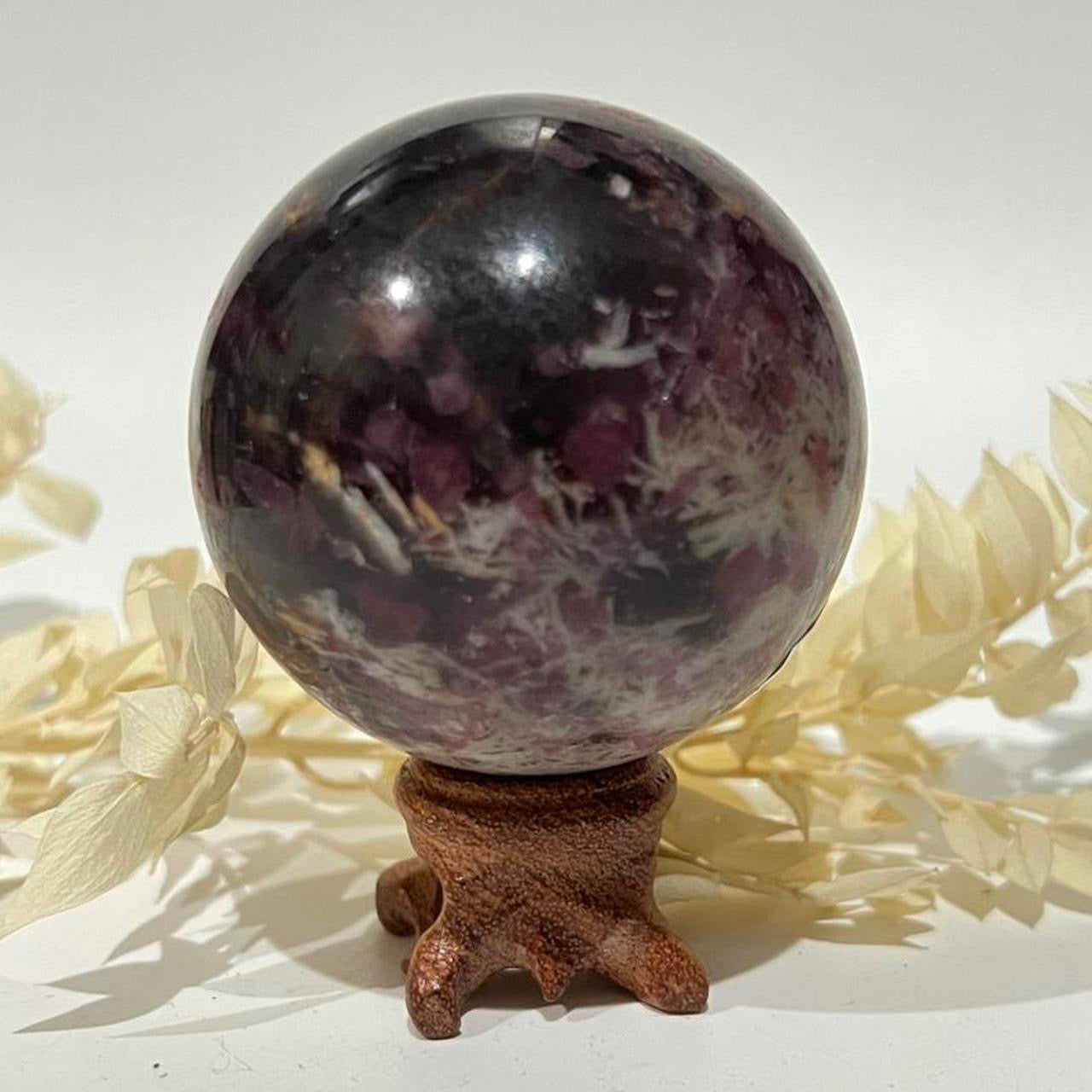 This absolutely stunning Pegmatite Sphere is a rare crystal found in Madagascar. It is made up of Pink Tourmaline, Lepidolite and Smokey Quartz.